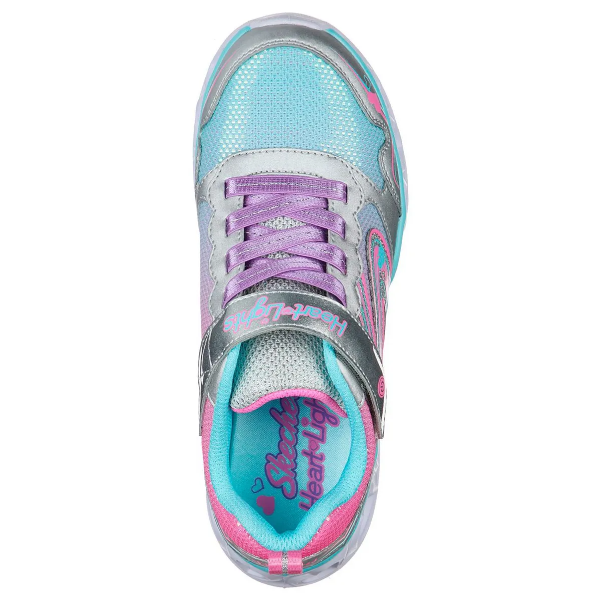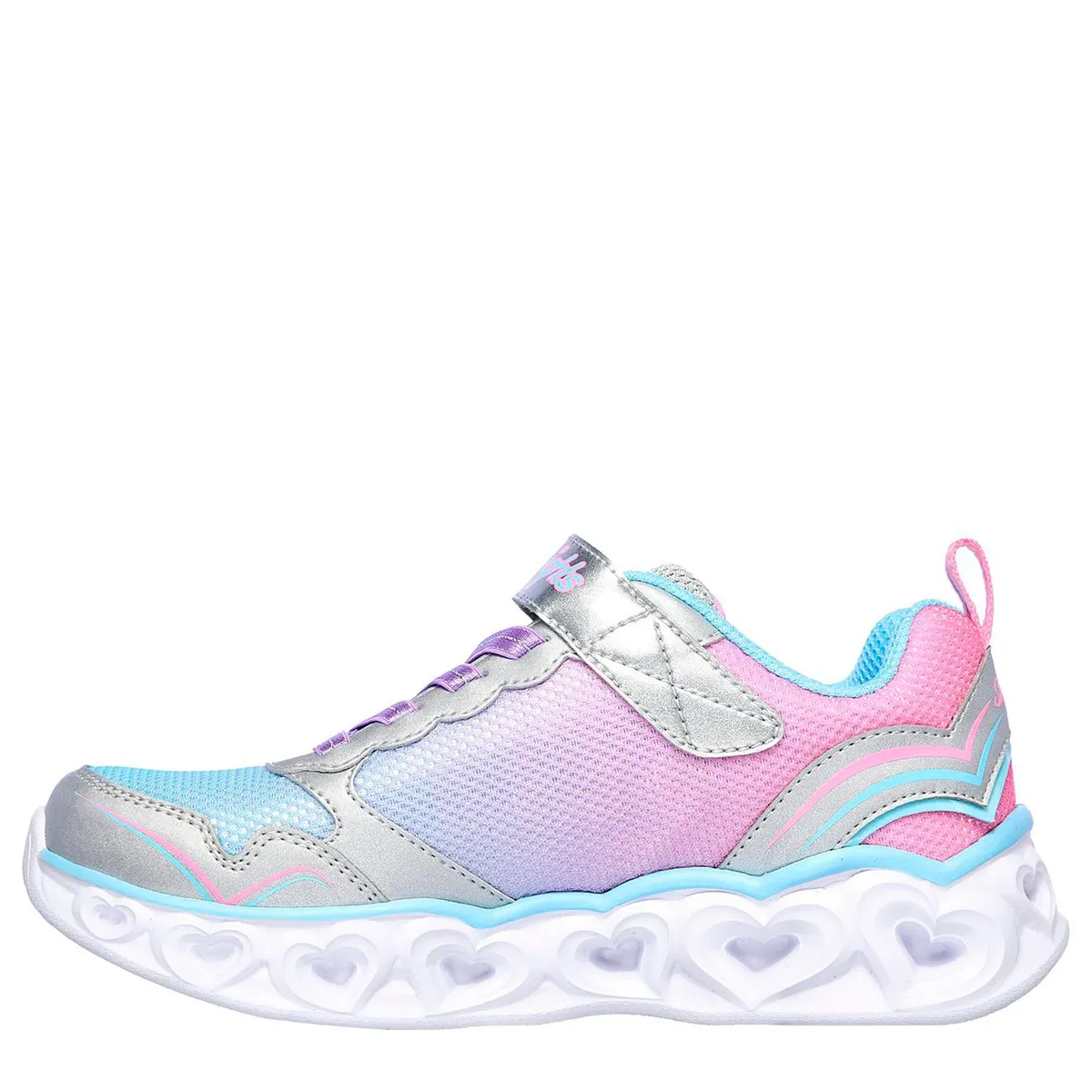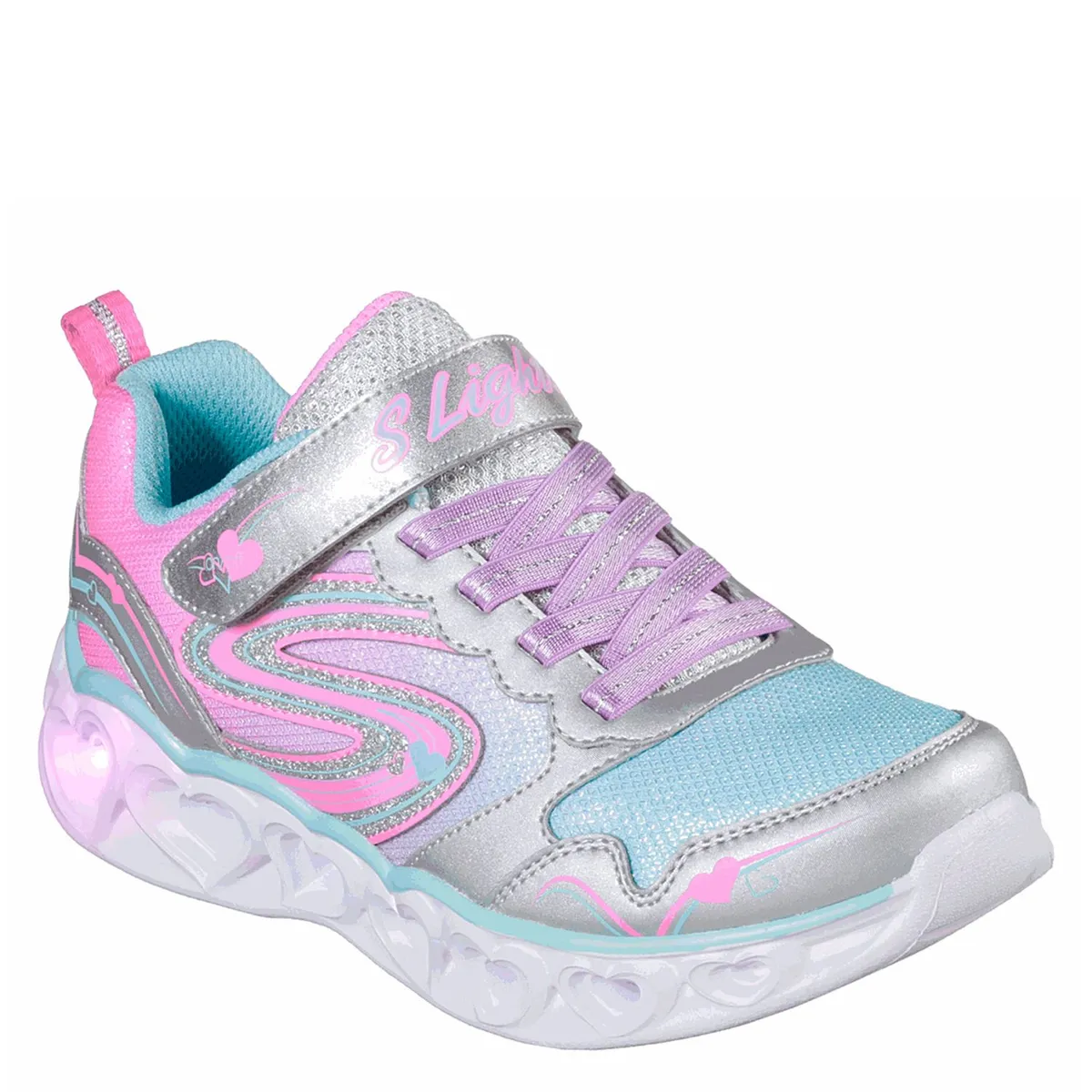 Las Skechers S Lights: Heart Lights - Love Spark destacan por su diseño deportivo con detalles de corazones y luces multicolor en la media suela. Su parte superior de malla y material sintético ofrece ligereza y comodidad.