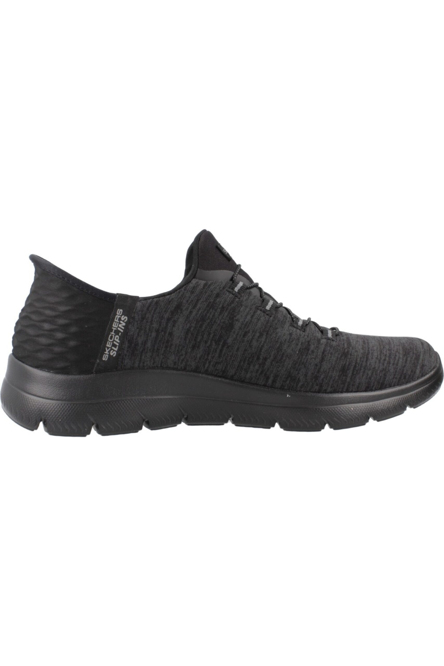 Aumenta el ritmo con las Skechers Slip-ins® Summits - Dazzling Haze, fáciles de calzar y diseñadas para el máximo confort. Su parte superior de knit jaspeado con cordones elásticos y sistema Heel Pillow™ ofrece un ajuste cómodo y seguro. Incorporan plantilla Air-Cooled Memory Foam™ para una pisada suave, fresca y amortiguada.